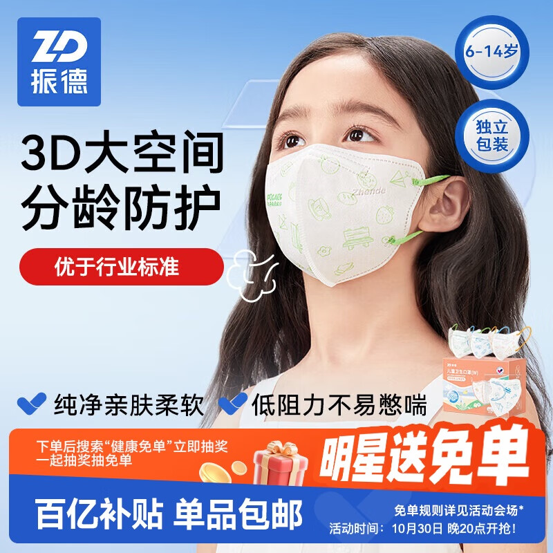 振德一次性儿童口罩6-12岁3D口罩冬季独立装透气防过敏粉尘鼻炎 30只