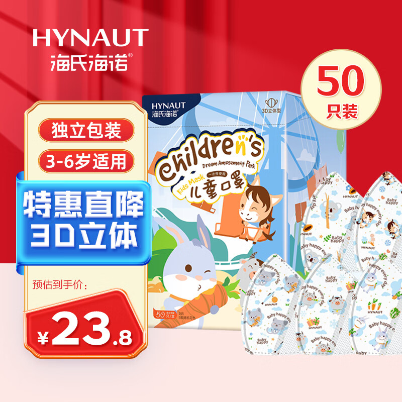海氏海诺一次性儿童口罩3-6岁独立包装一只一袋 3D小孩防尘防花粉50只