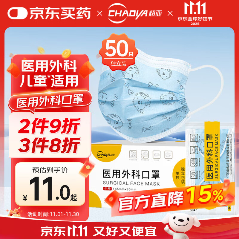 超亚独立包装儿童型医用外科口罩一次性口罩三层透气防过敏防尘50只装