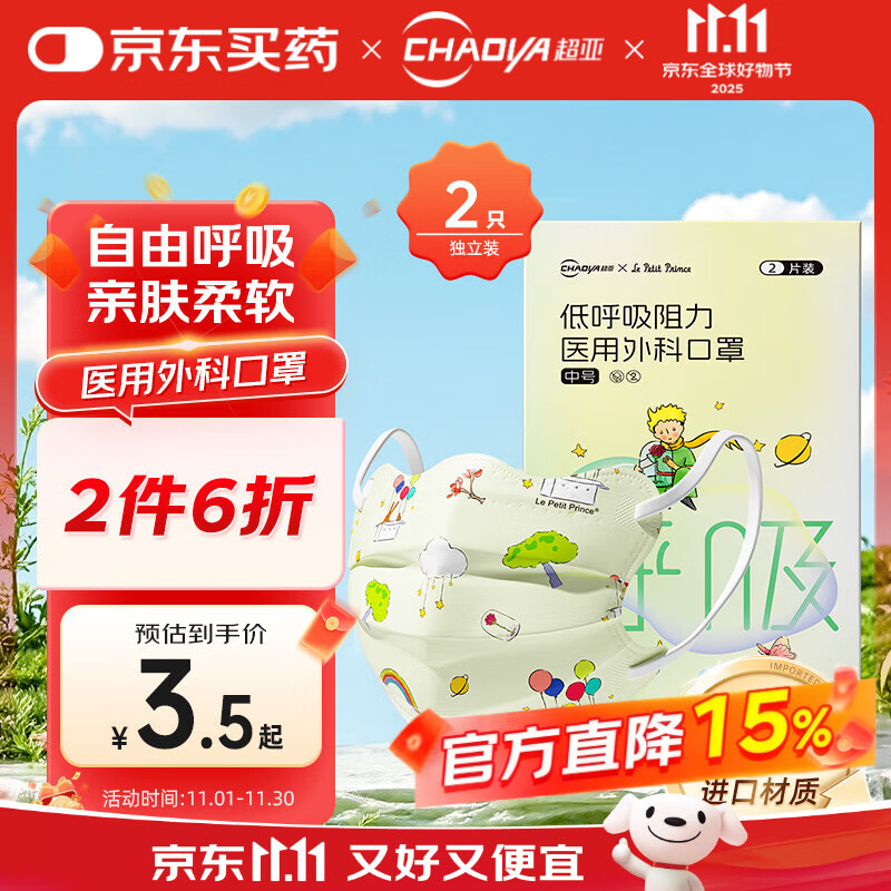 超亚低阻口罩一次性秋冬季医用外科口罩灭菌保暖 儿童小王子蝶形2只