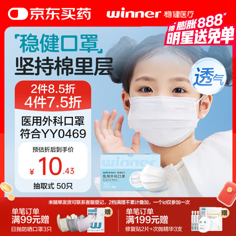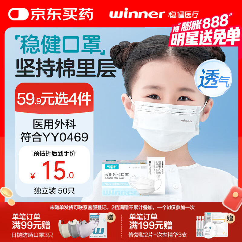 稳健(Winner)外科口罩一次性口罩儿童口罩成人口罩冬季防风高透气防细菌棉里层 1盒款成人白色 50只/盒