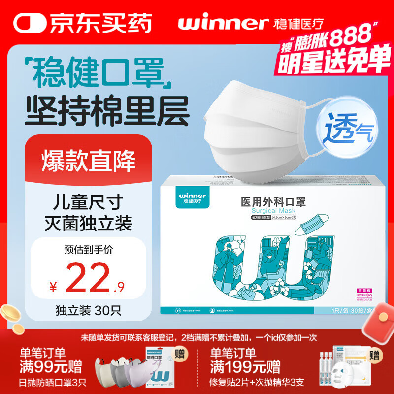 稳健一次性医用外科口罩儿童口罩灭菌级独立装30只 棉里层亲肤透气