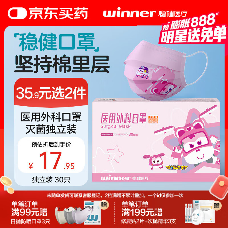 稳健一次性口罩医用外科口罩儿童灭菌独立装30袋14.5cm超级飞侠粉小爱