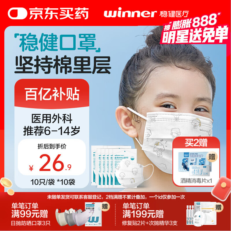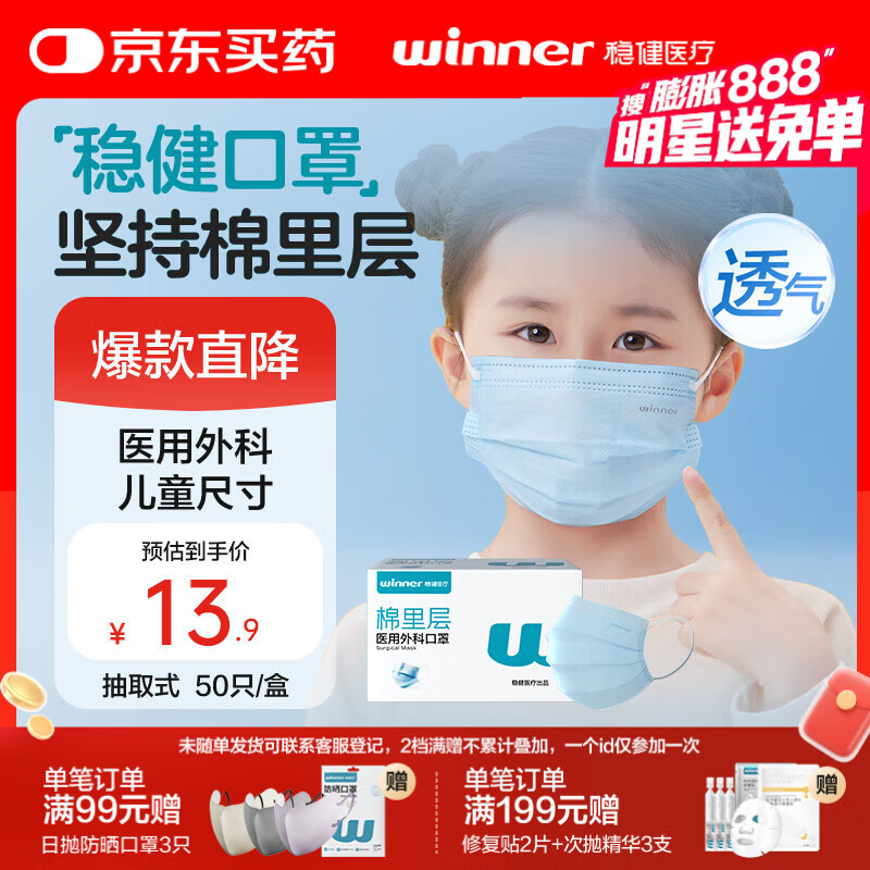 稳健一次性医用外科口罩儿童口罩独立装50只三层防护过滤率大于95%