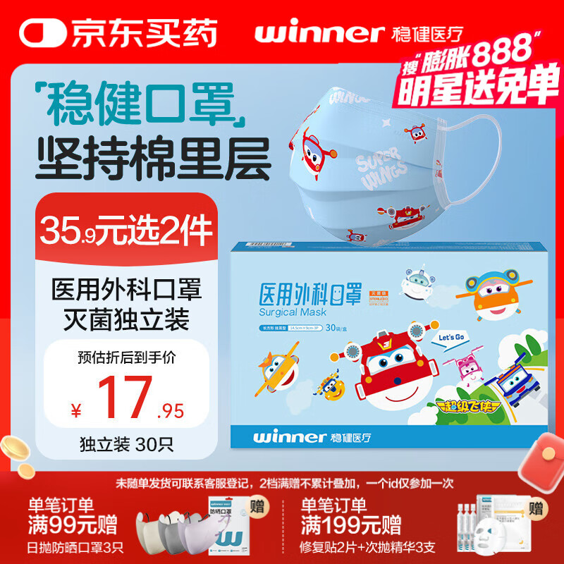稳健一次性医用口罩儿童口罩超级飞侠乐迪14.5cm 灭菌级独立装30袋
