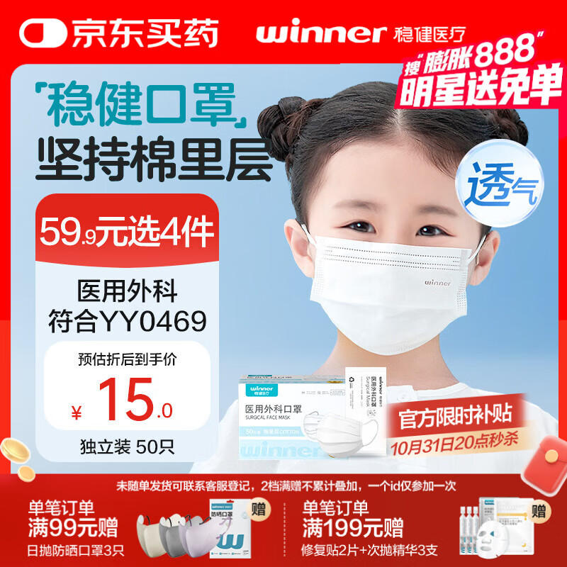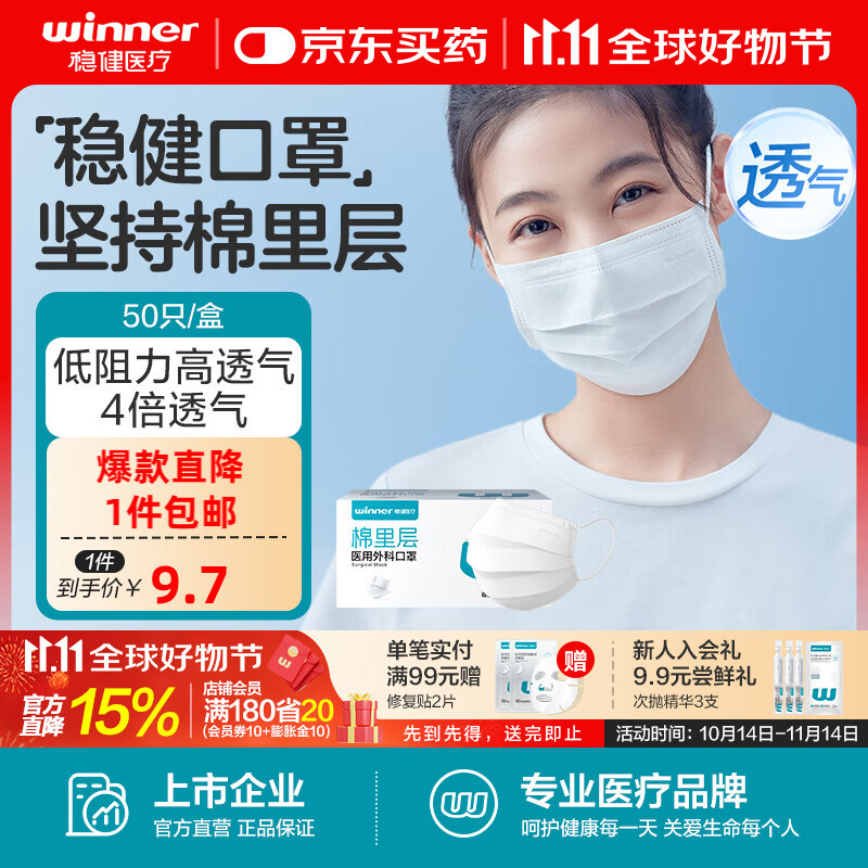 稳健(Winner)外科口罩一次性口罩儿童口罩成人口罩冬季防风高透气防细菌棉里层 1盒款成人白色 50只/盒