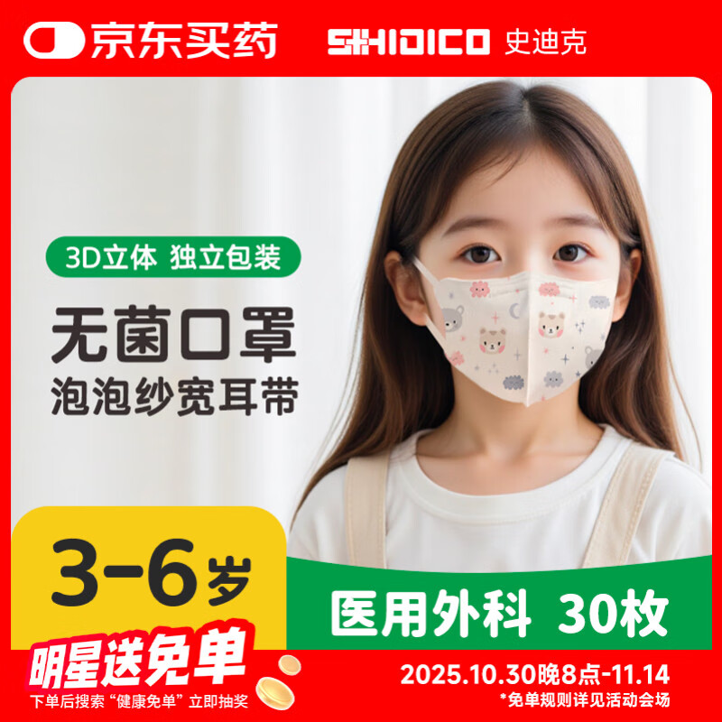 史迪克(SHIDICO)医用外科口罩独立包装30只 儿童口罩3-6岁幼儿宝宝 3D立体小灰熊