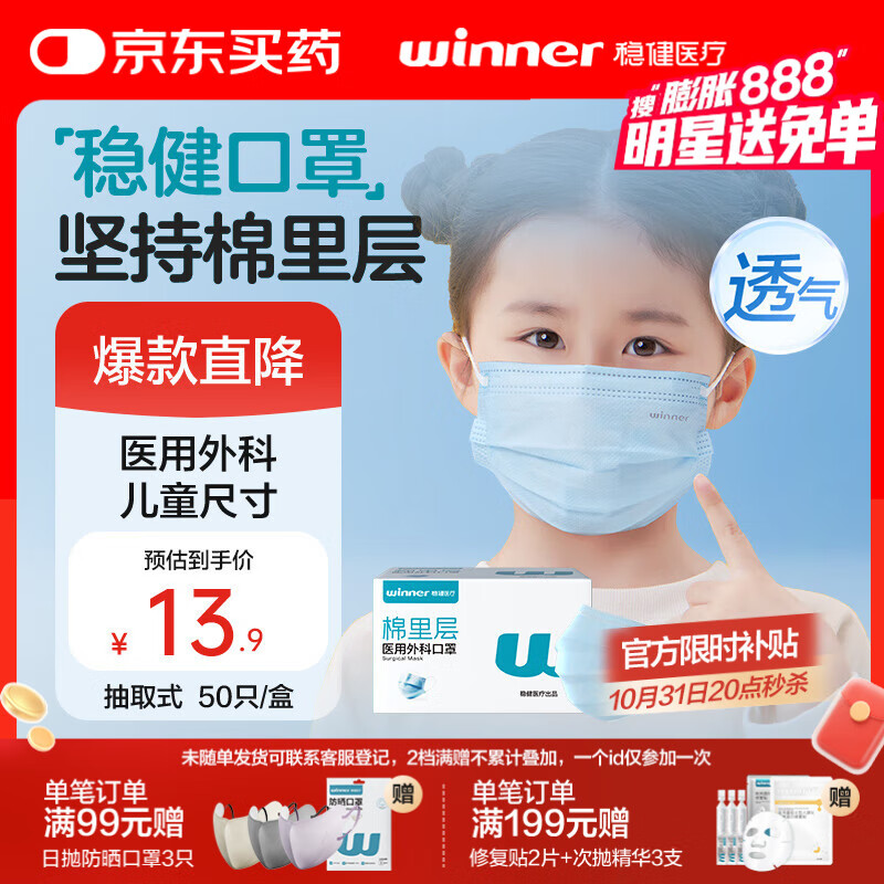 稳健一次性医用外科口罩儿童口罩独立装50只三层防护过滤率大于95%