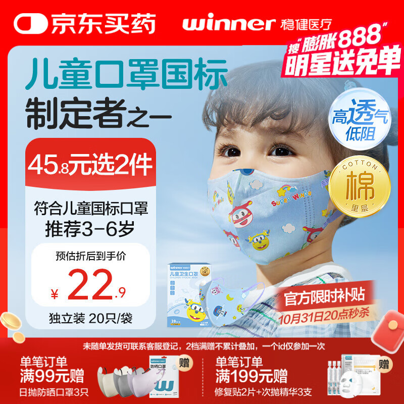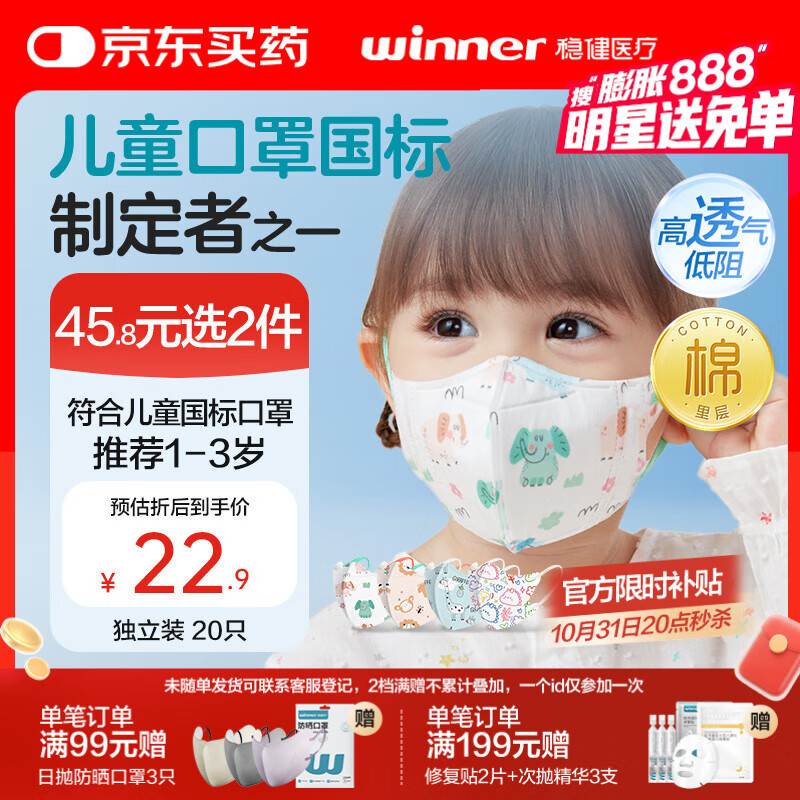 稳健棉里层儿童口罩1-3岁独立装一只一袋20只亲肤透气防尘秋冬季保暖