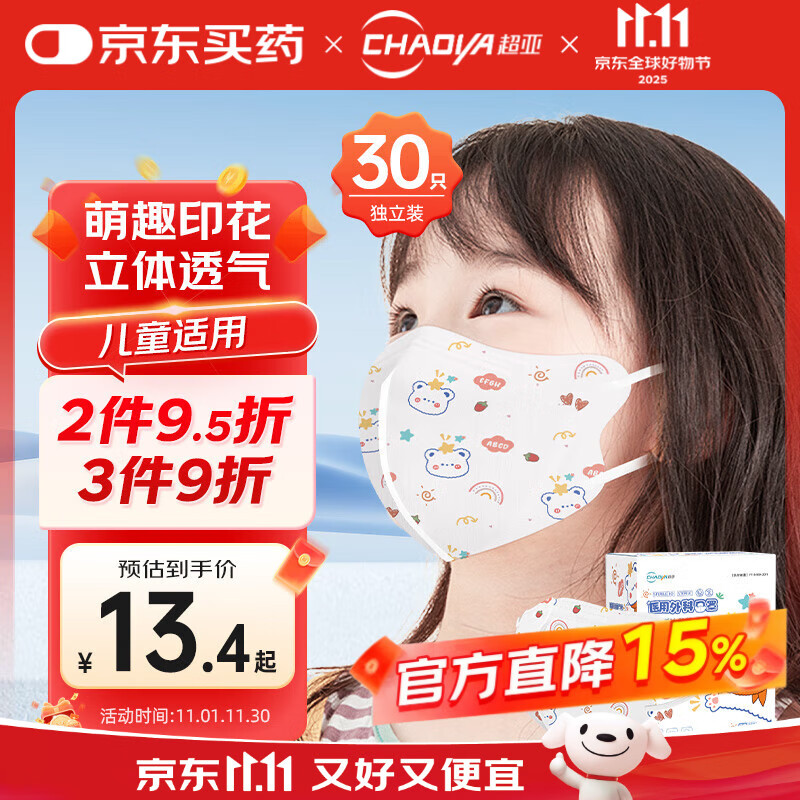 超亚 医用外科口罩3d立体儿童口罩3-6岁防过敏独立包装卡通30只/盒