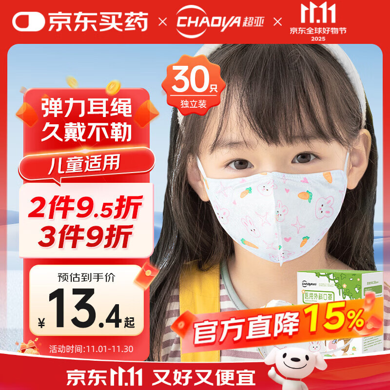 超亚 儿童医用外科口罩一次性3d立体透气医用口罩3-6岁防过敏30只/盒