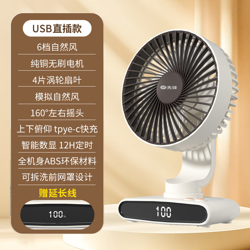 先锋台式电风扇家用大风力静音台扇空气循环桌面小风扇摇头电扇 USB直插款【数显定时】自动摇头-送延长线