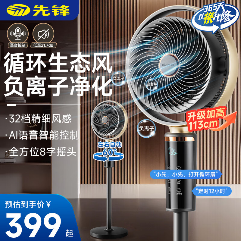 先锋空气循环扇家用语音遥控台立式节能轻音电风扇3D智能摇头涡轮送风电扇 【直流电机】32档风量智能净化循环扇