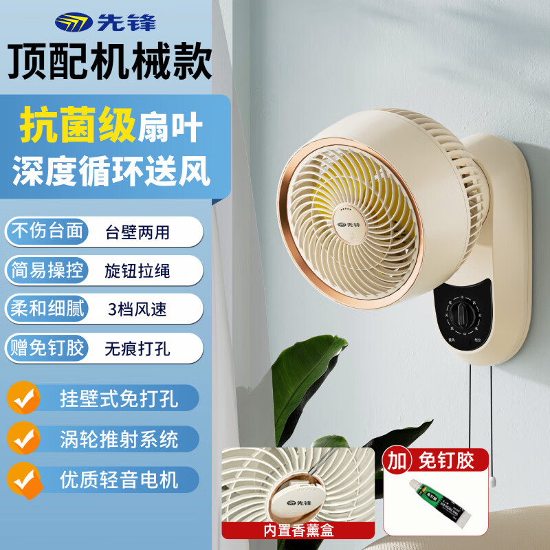先锋壁扇家用电风扇小型壁挂式空气循环壁扇厨房卫生间免打孔挂墙 机械款-抗菌级扇叶+深度循环送风