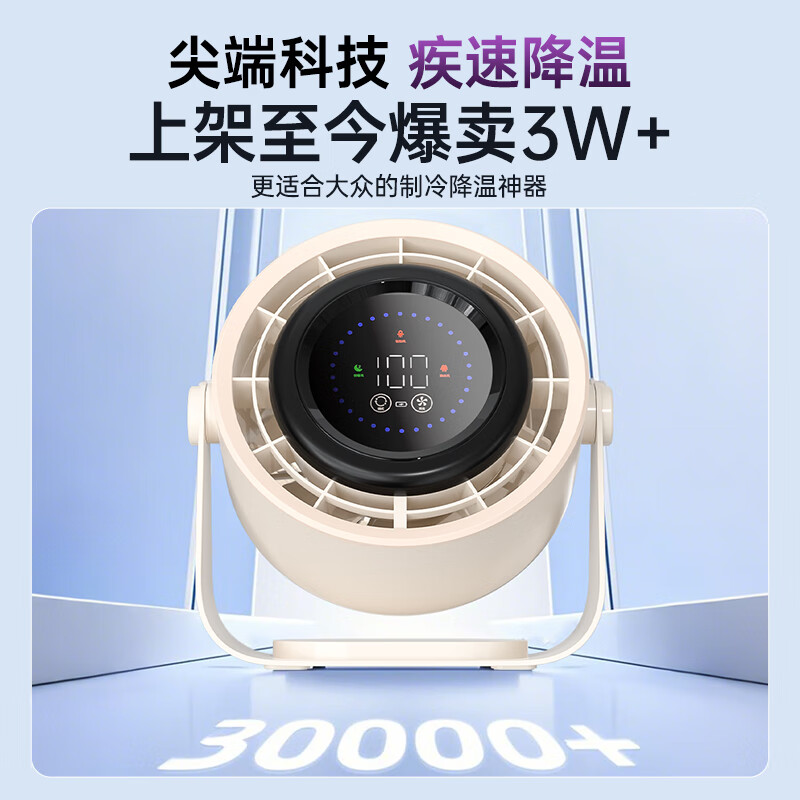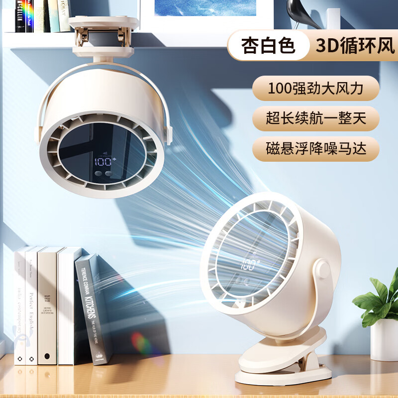 先锋BSC桌面风扇大屏USB空气循环扇小风扇夹扇宿舍卧室办公室台式壁挂式电风扇 台夹无叶循环扇-插电数显款米白