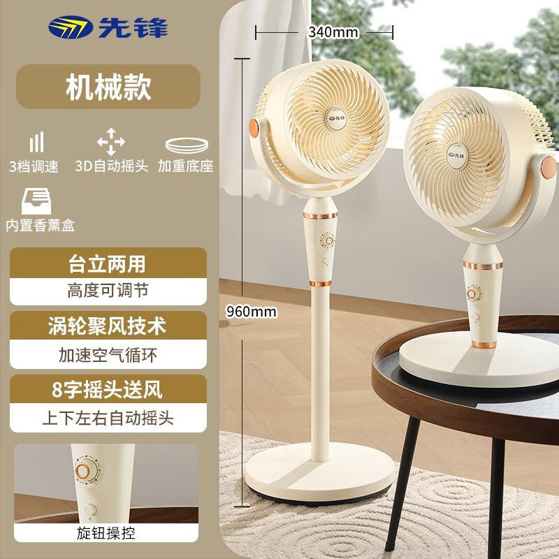 先锋空气循环扇遥控电风扇家用摇头轻音低噪大风力电扇涡轮换气扇循环对流风扇落地扇 奶油风机械款-【抗菌扇叶+香薰】