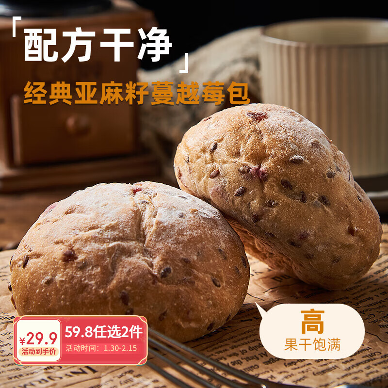 趣尝鲜亚麻籽蔓越莓欧包 400克(8个)冷冻面包懒人早餐全麦吐司三明治