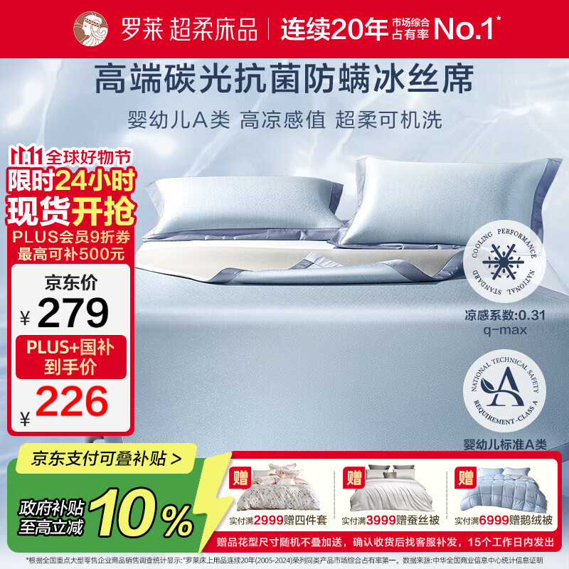 罗莱家纺 母婴A类冰丝席【可机洗】抗菌防螨凉席子三件套 蓝180*200
