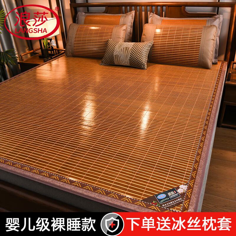 浪莎(langsha)冰丝凉席竹席夏季光滑竹凉席1.5x2米席子夏天单人宿舍折叠双面用 亲肤款5+1直筒席-A面竹席B面草席 150x195cm凉席+冰丝枕套一对