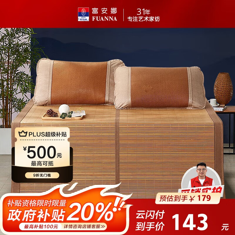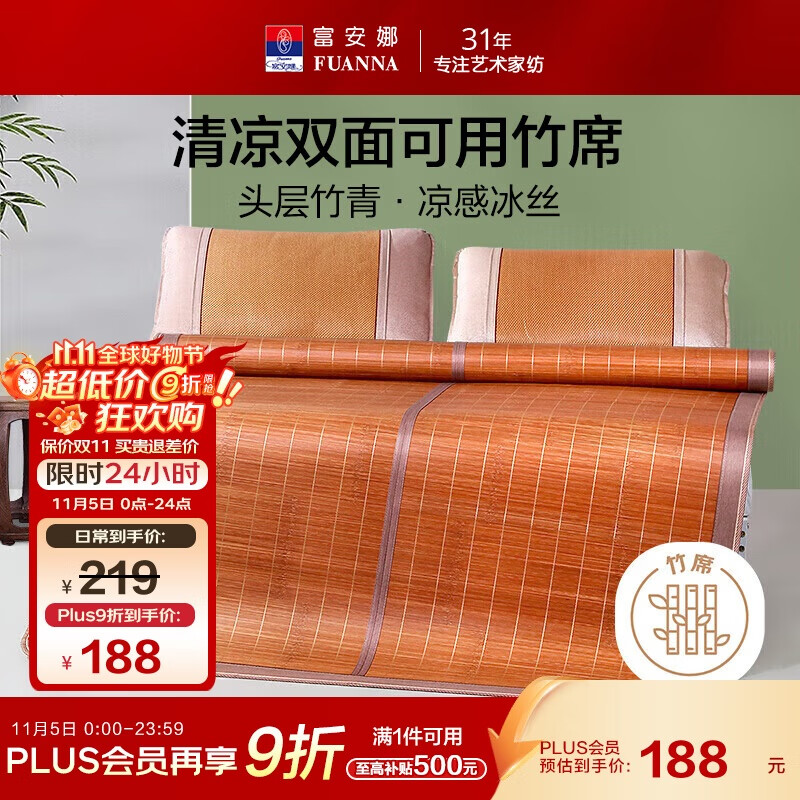富安娜头层竹青凉席竹席冰丝席双人单件席子1.8x2米【可折叠 双面可用】