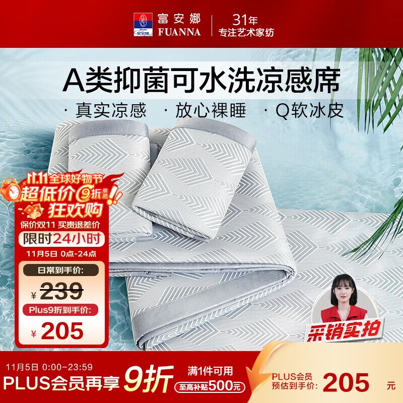 富安娜A类抗菌凉席可机洗冰丝席夏季凉感席子可折叠软席三件套1.8米x2米