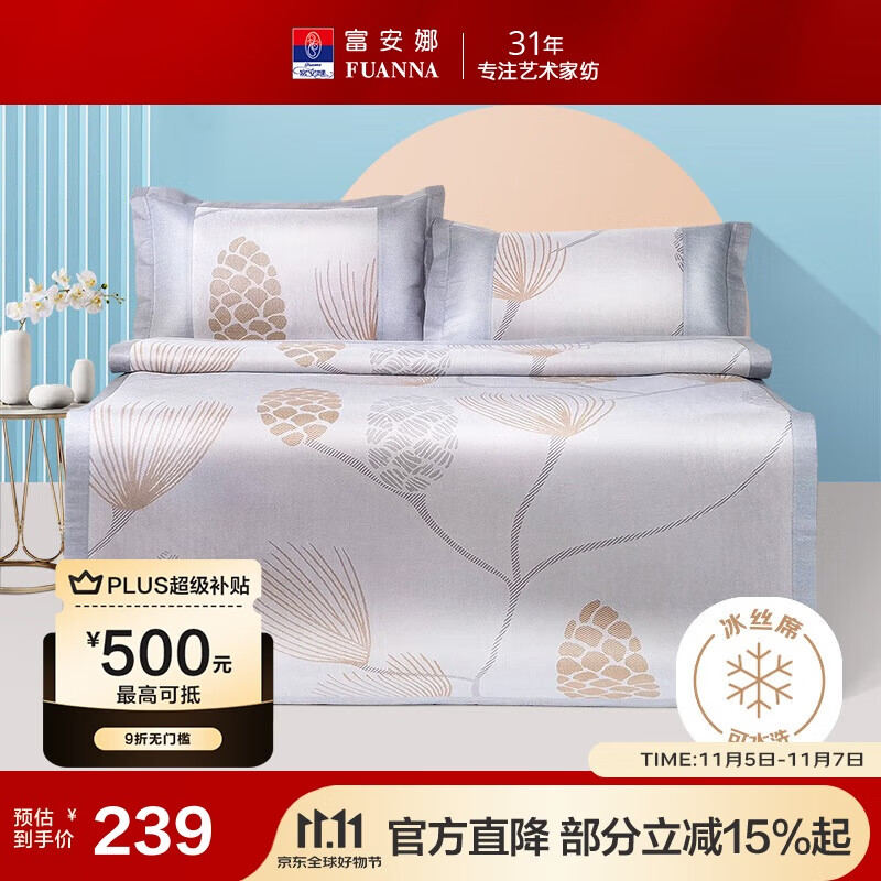 富安娜 松林 抗菌凉席冰丝席 三件套 咖色 1.5*2米【可折叠 可水洗】