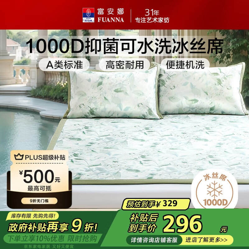 富安娜×JDear京东联名 凉席1000D冰丝席可水洗双人夏天席子1.8x2米薄荷
