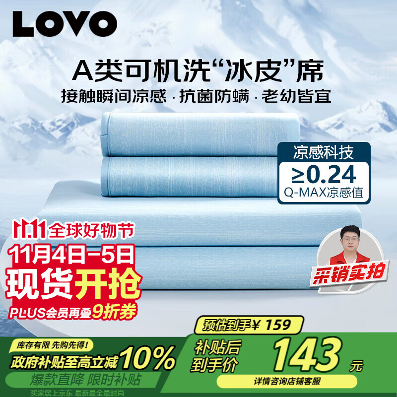 LOVO罗莱 A类冰丝席凉席床笠双人三件套蓝色180*200*30【可机洗】