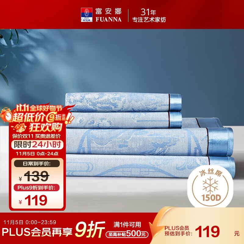富安娜凉席冰丝席夏凉席子夏天软凉席1.8x2米双人空调席可折叠三件套