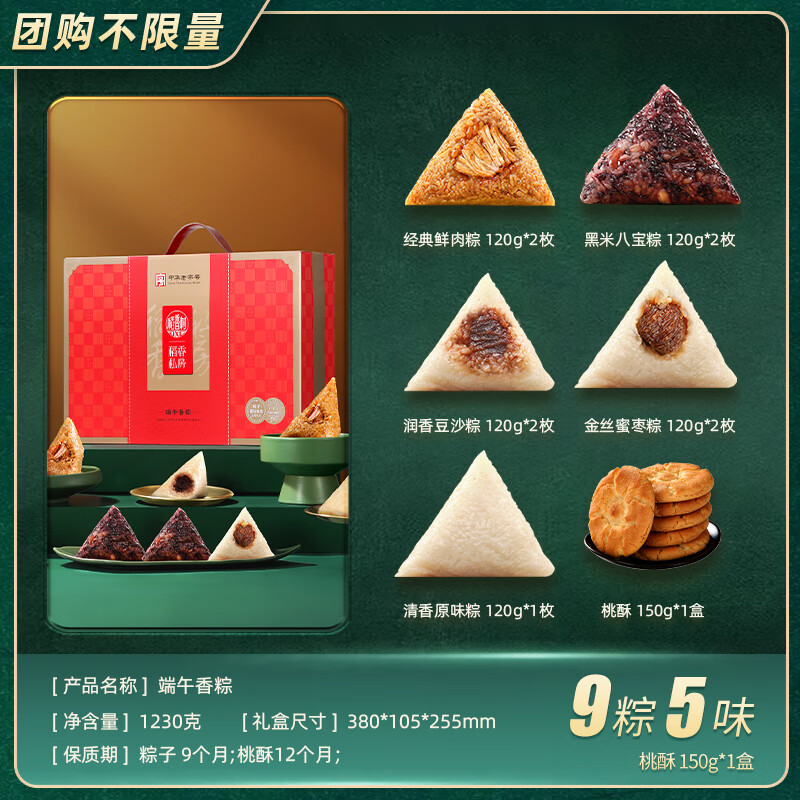 北京稻香村稻香私房粽子礼盒装鲜肉粽子黑米八宝豆沙蜜枣甜味早餐端午节礼品 【9粽5味+桃酥】端午香粽1230g.
