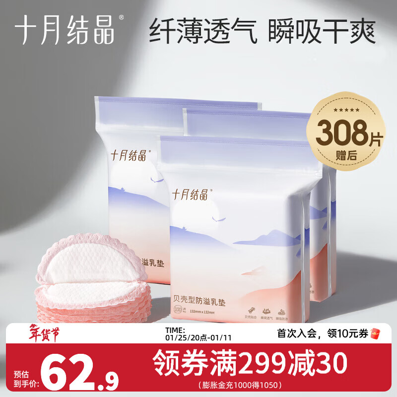 十月结晶防溢乳垫一次性超薄溢乳垫哺乳期防漏乳贴喂奶垫隔奶垫 308片装 【贝壳款超薄】赠后308片