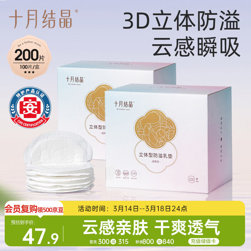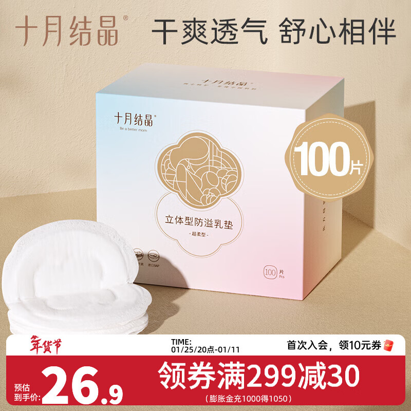 十月结晶防溢乳垫一次性溢乳垫超薄哺乳期母婴防漏奶垫乳贴 100片装 【经典立体型】26.9/盒