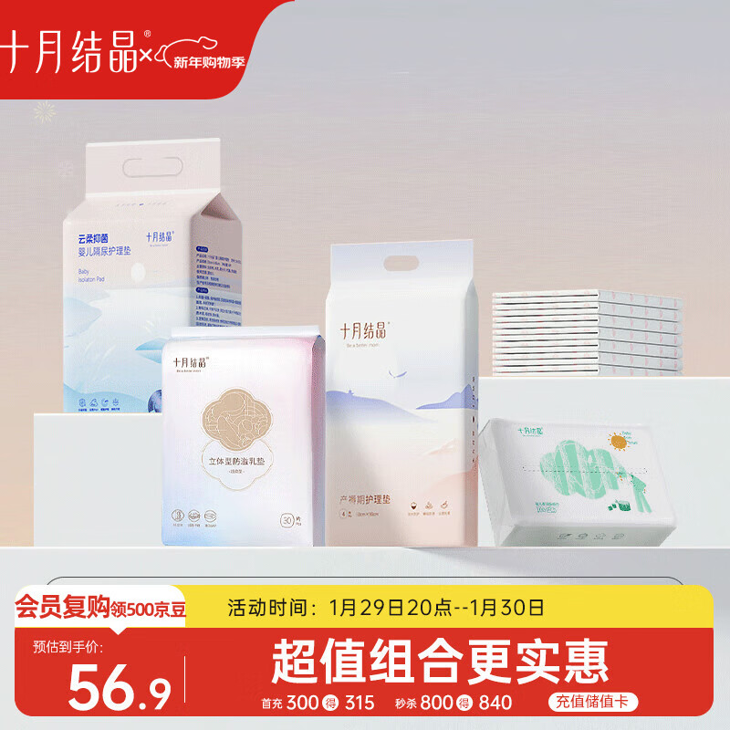 十月结晶防溢乳垫30片+婴儿隔尿垫6片+产褥垫4片+柔润纸100抽组合