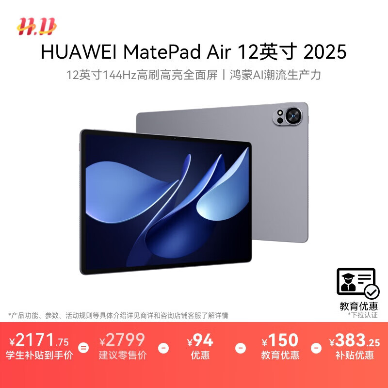 HUAWEI【教育优惠】MatePad Air 12英寸 2025 华为平板电脑 鸿蒙AI 2.8K全面屏 WIFI 8GB+256GB 烟云灰