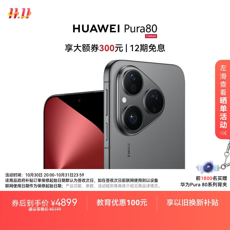 HUAWEI Pura 80 12GB+512GB 丝绒黑 丝绒直屏 红枫原色影像 全新鸿蒙AI 华为鸿蒙智能手机
