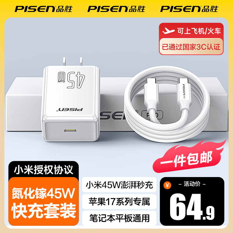 品胜(PISEN)3C认证PD45W氮化镓充电器Type-c快充澎湃秒冲适用苹果iPhone17/16小米协议华为手机平板笔记本40W 45W套装【小米澎湃秒充|苹果快充】