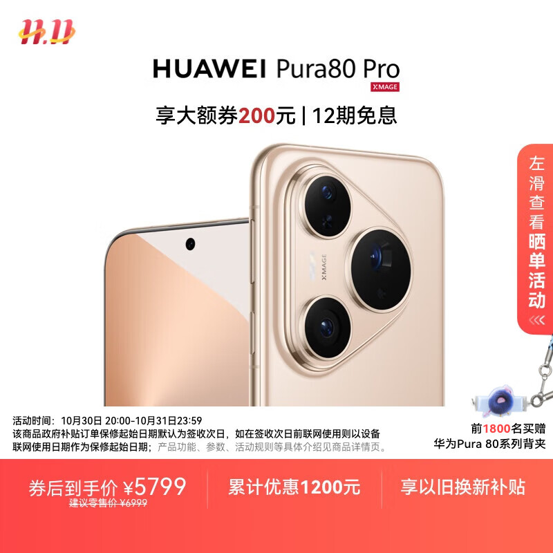 HUAWEI Pura 80 Pro 12GB+512GB 釉金一英寸主摄 个性色卡 AI辅助构图 华为鸿蒙智能手机