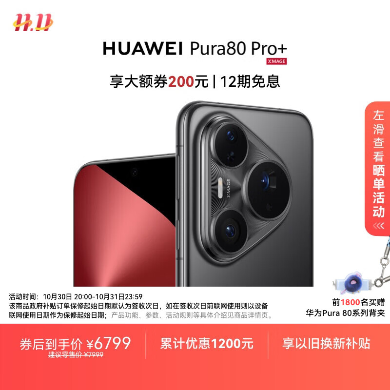 HUAWEI Pura 80 Pro+ 16GB+512GB 釉黑一英寸高动态主摄 个性色卡AI辅助构图 华为鸿蒙智能手机