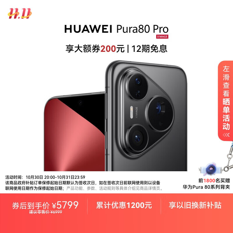 HUAWEI Pura 80 Pro 12GB+512GB 釉黑一英寸主摄 个性色卡 AI辅助构图 华为鸿蒙智能手机