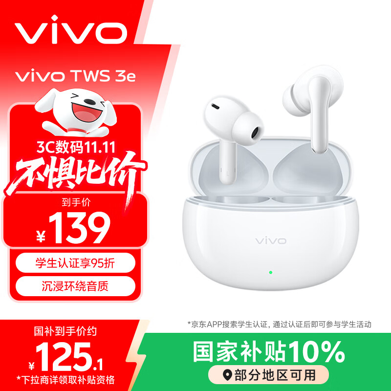 vivo TWS 3e 皓白 沉浸环绕音质 44H超长续航 智能主动降噪适配小米苹果华为手机 vivo情人节送女生