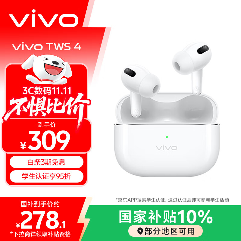 vivo TWS 4真无线降噪耳机 国家补贴 高保真Hi-Fi级音质55dB深海降噪 适配苹果小米华为手机远峰白