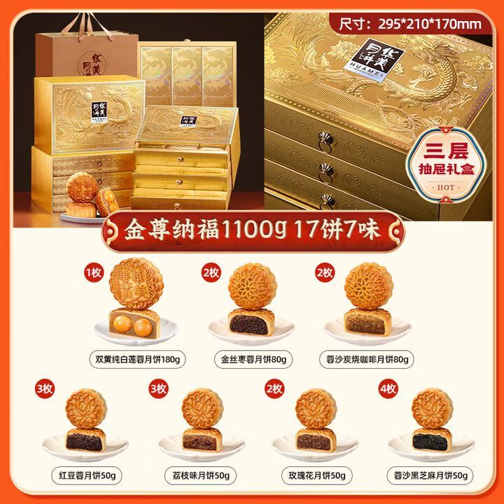 华美中秋月饼礼盒金尊纳福双黄纯白莲蓉华章颂月1080g(精装三层) 三层礼盒金尊纳福【17饼7味 送礼袋】