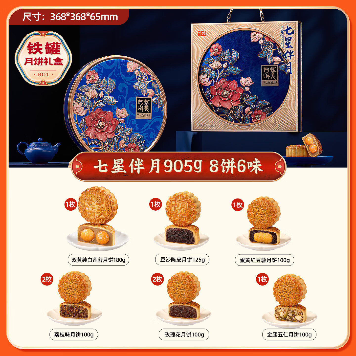华美七星伴月蛋黄莲蓉广式五仁月饼礼盒装中秋团购2025年新款905g 【8饼6味 905g】七星伴月【精美手提礼盒装】