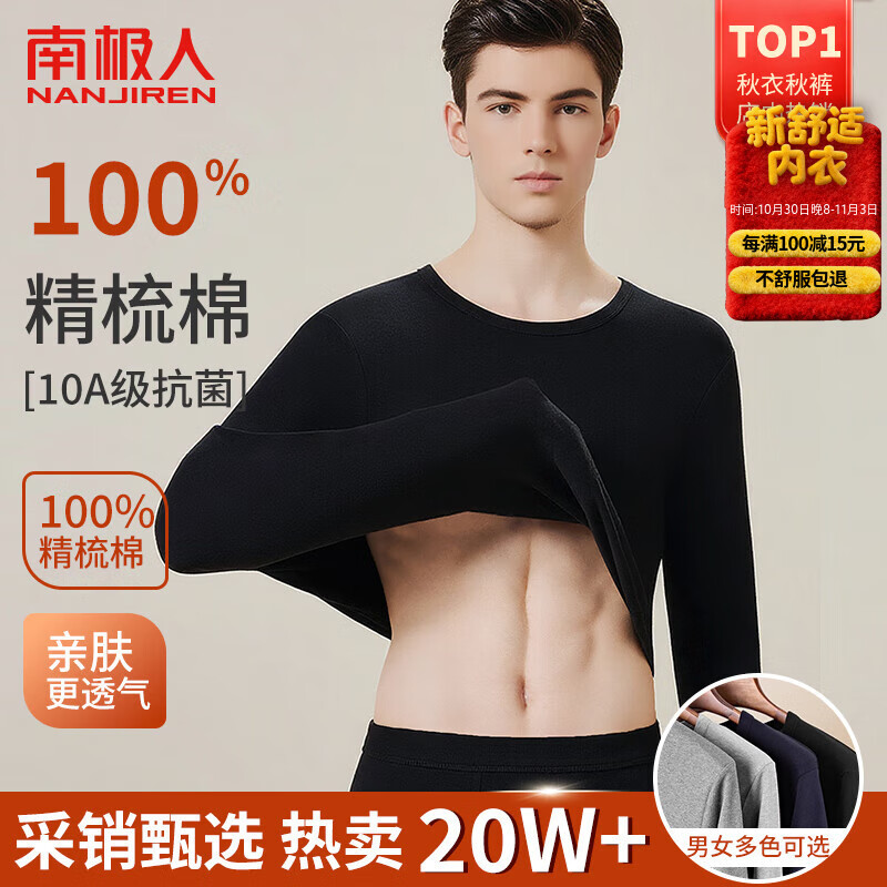南极人男士秋衣秋裤男套装纯棉抗菌薄款保暖内衣男打底线衣棉毛衫黑色XL
