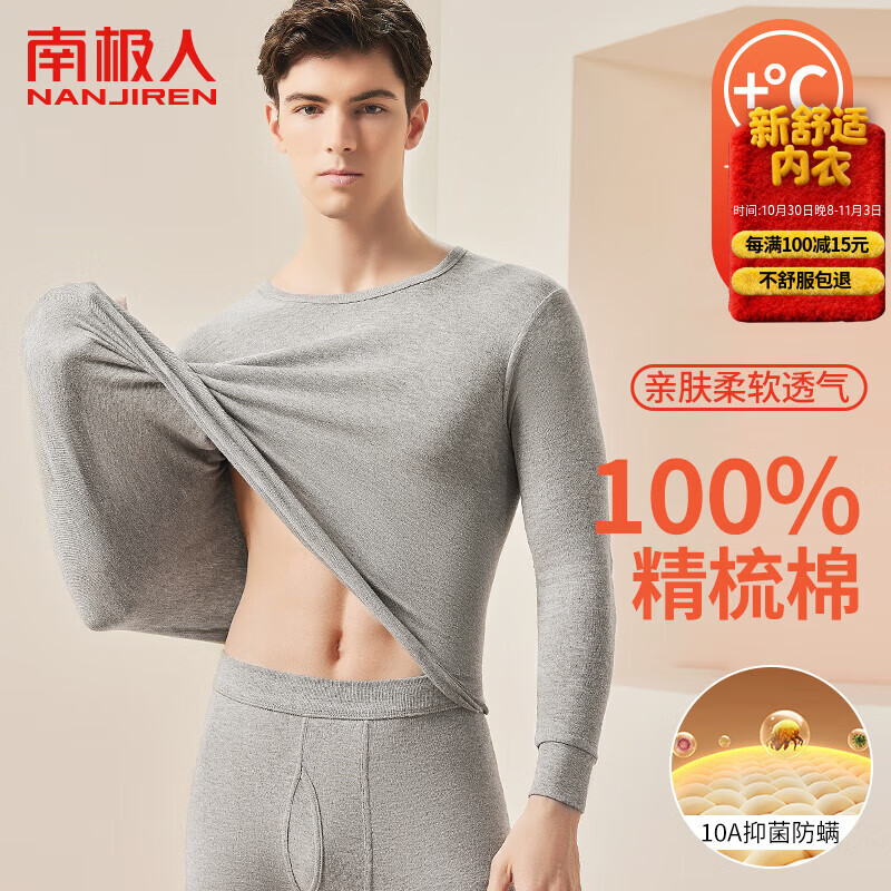 南极人男士秋衣秋裤男套装纯棉抑菌薄款保暖内衣男打底棉毛衫麻灰XL