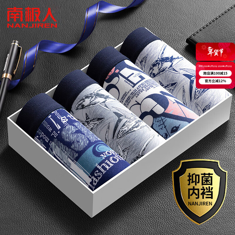 南极人(Nanjiren)男士内裤男平角裤纯棉舒适透气抑菌裆中腰青少年宽松大码短裤头 潮流时尚 4条 M 【建议100斤以下】