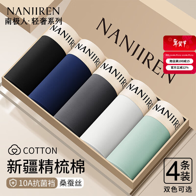 南极人【精梳棉10A抑菌】男士内裤男纯棉平角裤蚕丝内档升级新品4条XL
