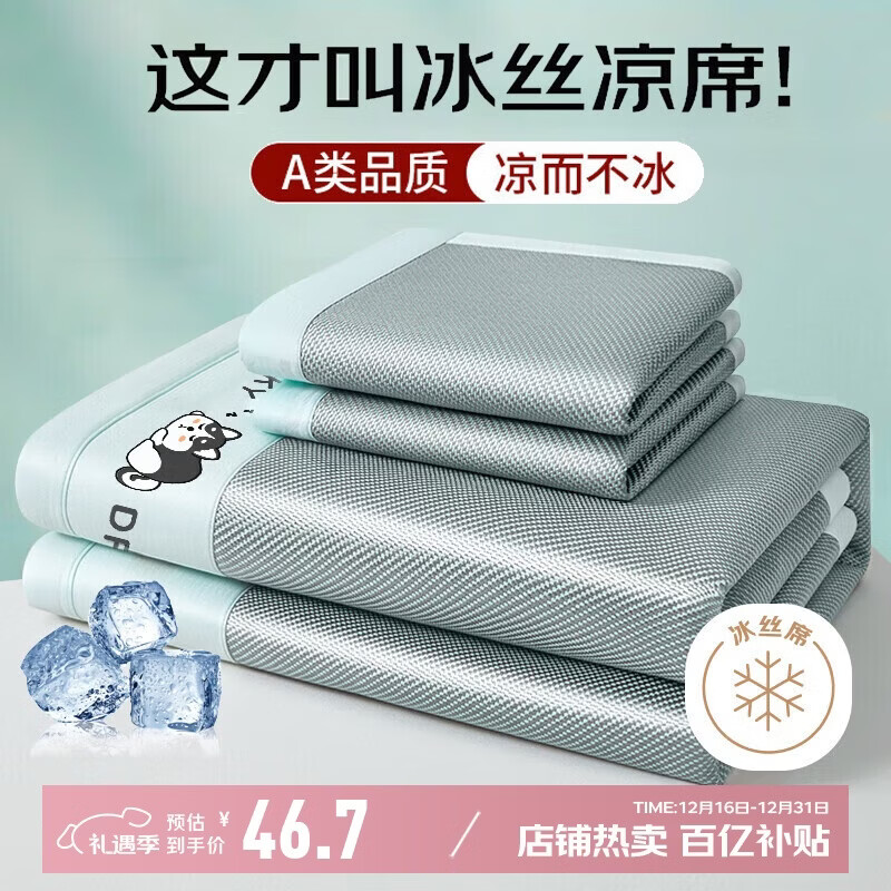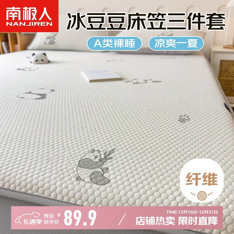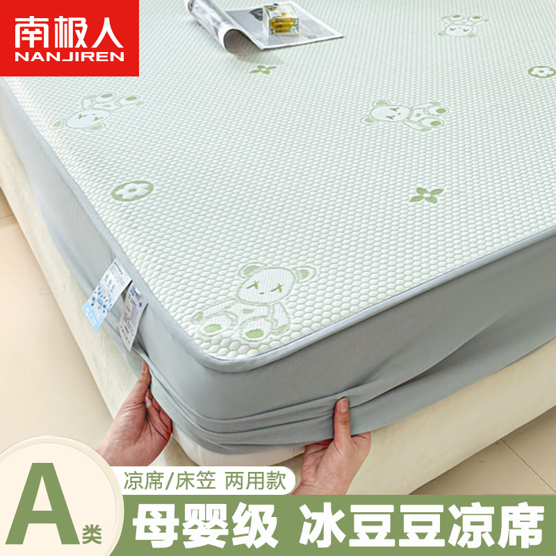 南极人凉豆豆A类抗菌冰丝席三件套双人凉席床笠款席子1.5米床【可水洗】