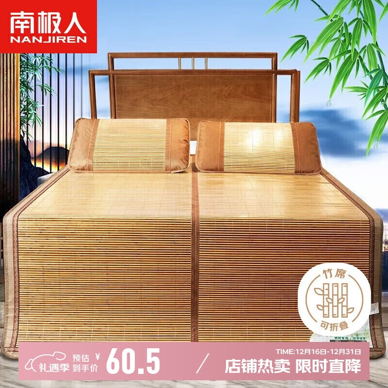 南极人(Nanjiren)天然碳化竹青竹席 双人凉席三件套1.5x2米床【双面可用可折叠】