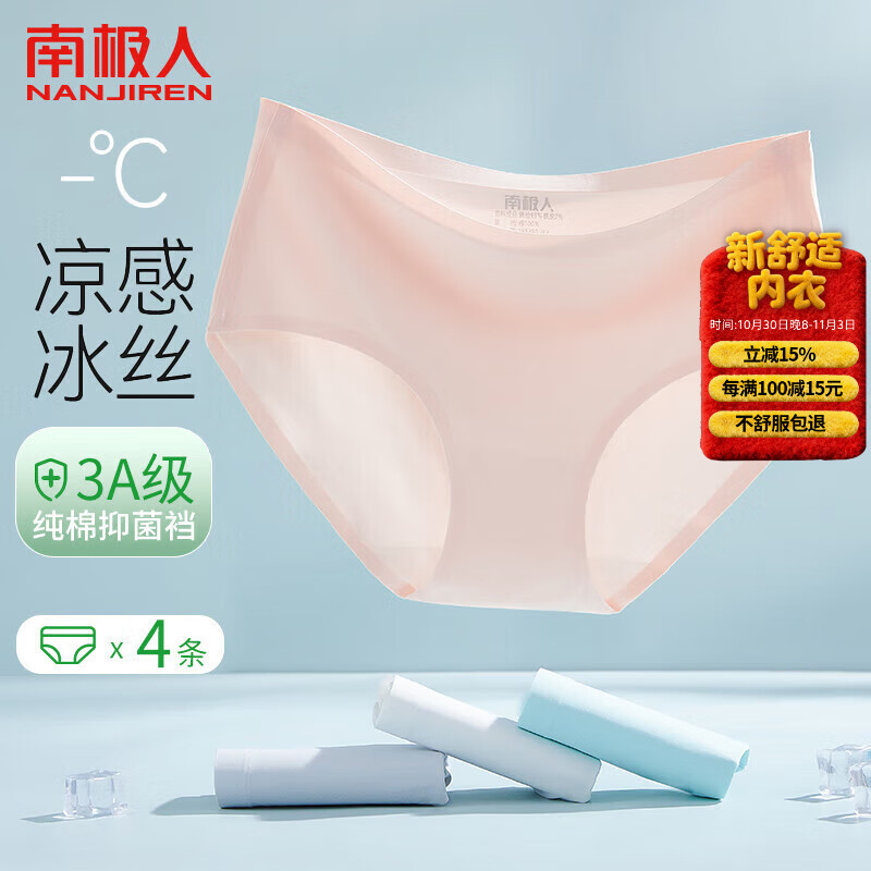 南极人4条无痕内裤女冰丝纯棉100%棉裆女士内裤隐形裸感三角裤XL